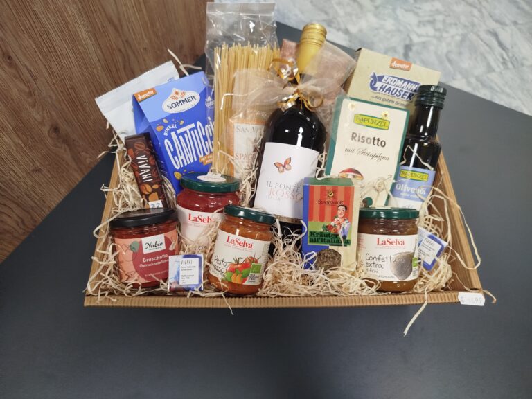 Bei uns finden Sie die volle Bandbreite der Produkte aus der Biobranche und einige erlesene Produkte aus der Region. Kennen Sie schon den hausgemachten Kartoffelsalat? Vielleicht sind auch unsere Präsentkörbe etwas für Sie.
